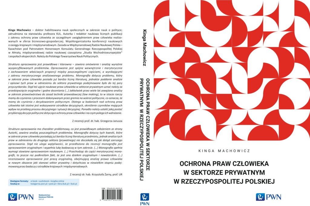 Skoro do rozwiązywania krytycznych problemów bardzo często przyczynia się nauka, to z przyjemnością informujemy, że ukazała się najnowsza publikacja autorstwa dr hab. Kingi Machowicz, prof. KUL. Książka zatytułowana „Ochrona praw człowieka w sektorze prywatnym w Rzeczypospolitej Polskiej” ukazała się nakładem Wydawnictwa Naukowego PWN SA.