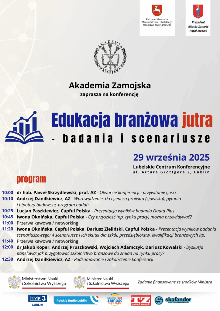 29 września w Lubelskim Centrum Konferencyjnym przy ul. Grottgera odbędzie się konferencja „Edukacja branżowa jutra” inaugurująca cykl konferencji regionalnych podsumowujących wyniki projektu „Badania naukowe nad systemem dostosowania oferty szkolnictwa branżowego do potrzeb lokalnych rynków pracy z wykorzystaniem metod i technik predykcyjnych”.
